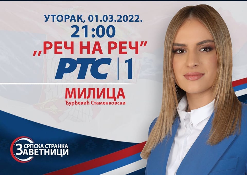 Председнички кандидат и носилац изборне листе Српске странке Заветници, Милица Ђурђевић Стаменковски, гостоваће у уторак од 21 час у емисији Реч на реч на првом програму РТС.
