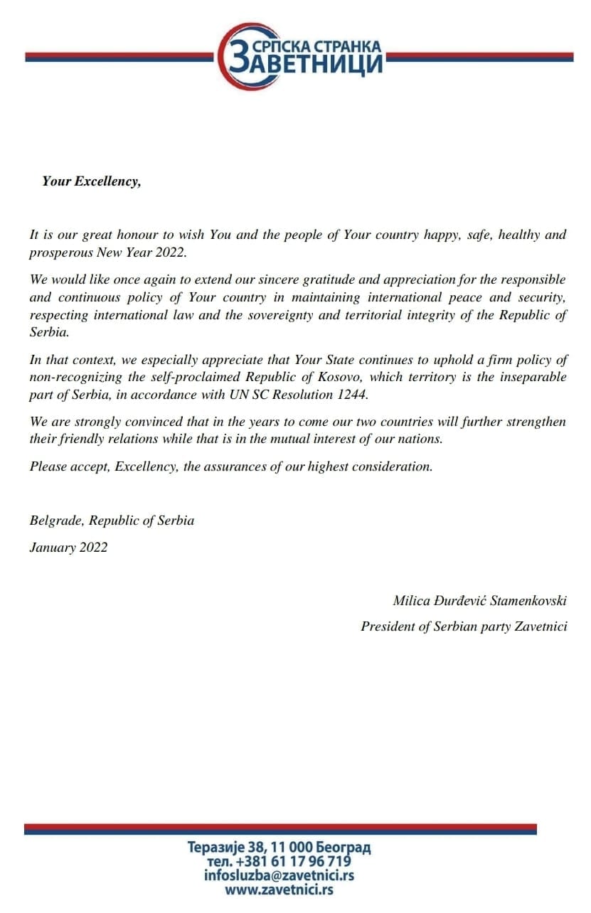 Српска странка Заветници честитала је Нову годину и упутила писмо захвалности амбасадорима земаља чланица УН које нису признале самопроглашену Републику Косово односно које су повукле своју одлуку о признању.